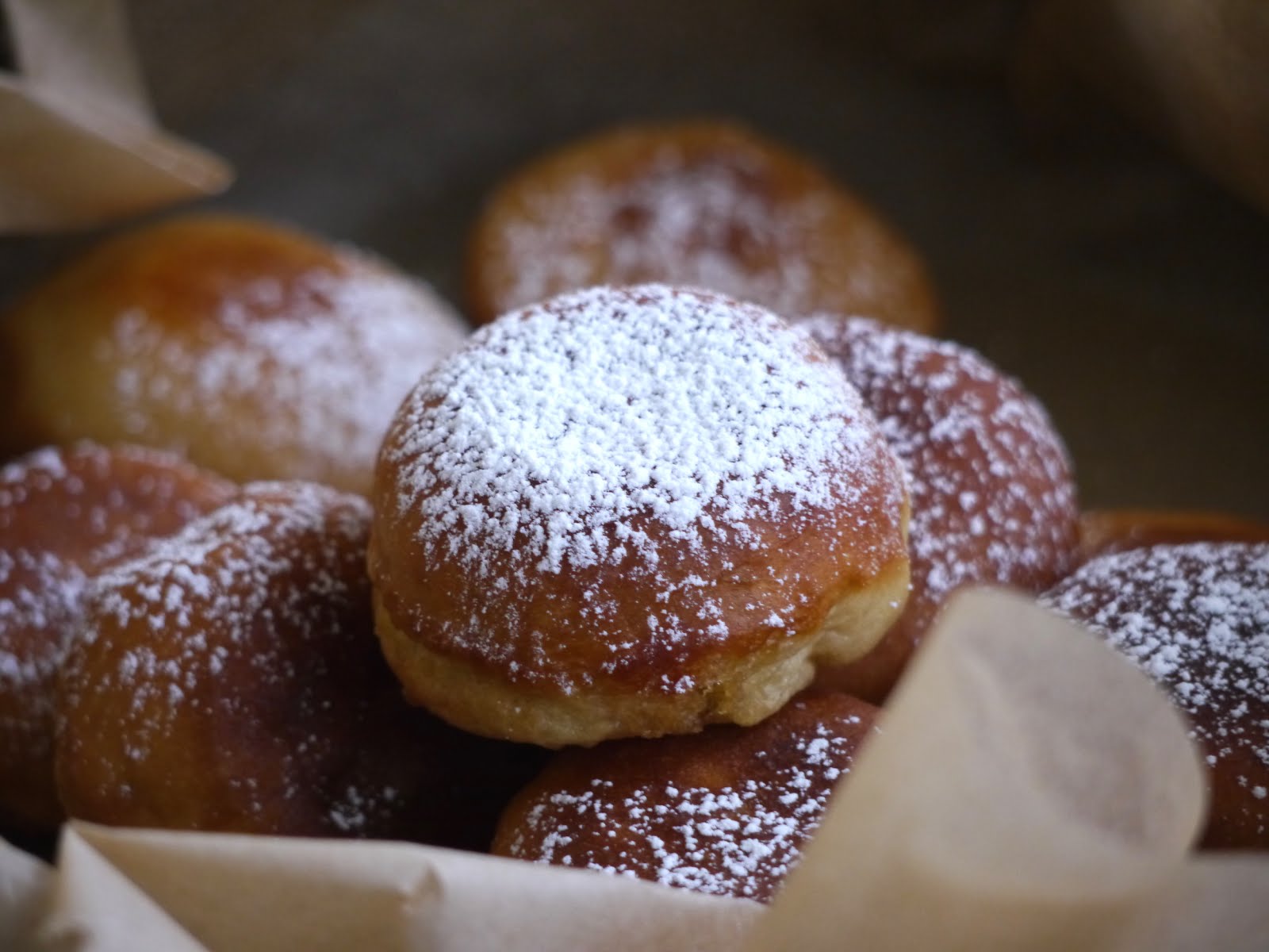 Wenn die kleinen Krapfen fertig frittiert sind, auf einem Stückchen Küchenpapier abtropfen lassen und noch heiß mithilfe einer Plastikspritze oder einem Spritzbeutel mit sehr dünnem Aufsatz die gewünschte Füllung ins Herz des Krapfens spritzen und mit Zucker bestäuben.