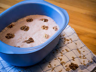 Mit Knethaken oder einer Küchenmaschine beginnen den Teig zu verquirlen und nach und nach das Wasser aus dem Messbecher dazuschütten. Wenn der Teig schon relativ gleichmäßig vermengt ist, den Walnussbruch dazugeben und nochmals gut verrühren. Wenn die komplette Wassermenge verbraucht ist, sollte ein sehr zähflüssiger Teig entstanden sein.Nun eine Backform (z.B. Kastenform) einfetten, mit etwas mit Mehl bestäuben und den kompletten Teig in die Form geben. Auf die Oberfläche werden noch ein paar Walnusshälften gedrückt.